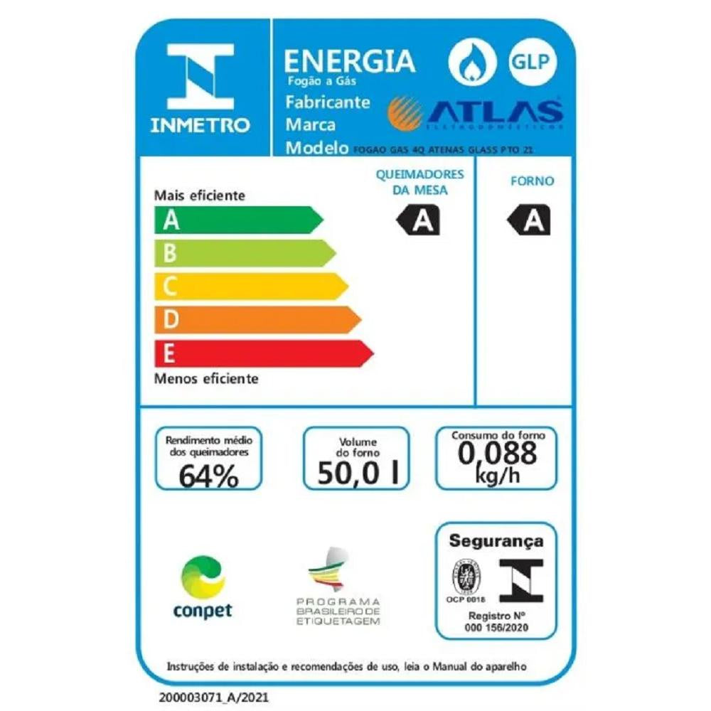O lançamento Atlas Atenas Glass possui excelente acabamento, mesa de vidro temperado sem bordas, acendimento automático, grades individuais de aço esmaltado com 6 pontos de apoio, que dão mais estabilidade para suas panelas, puxador amplo, botões removíveis e pés altos e robustos, que facilitam na hora da limpeza.